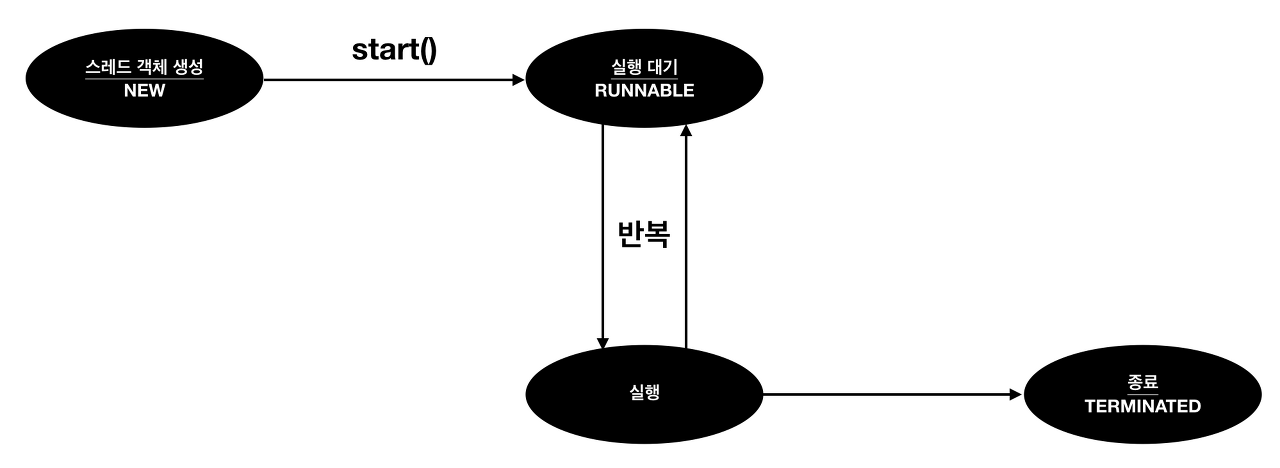 | 객체 생성 | NEW | 스레드 객체가 생성, 아직 start() 메소드가 호출되지 않은 상태 |