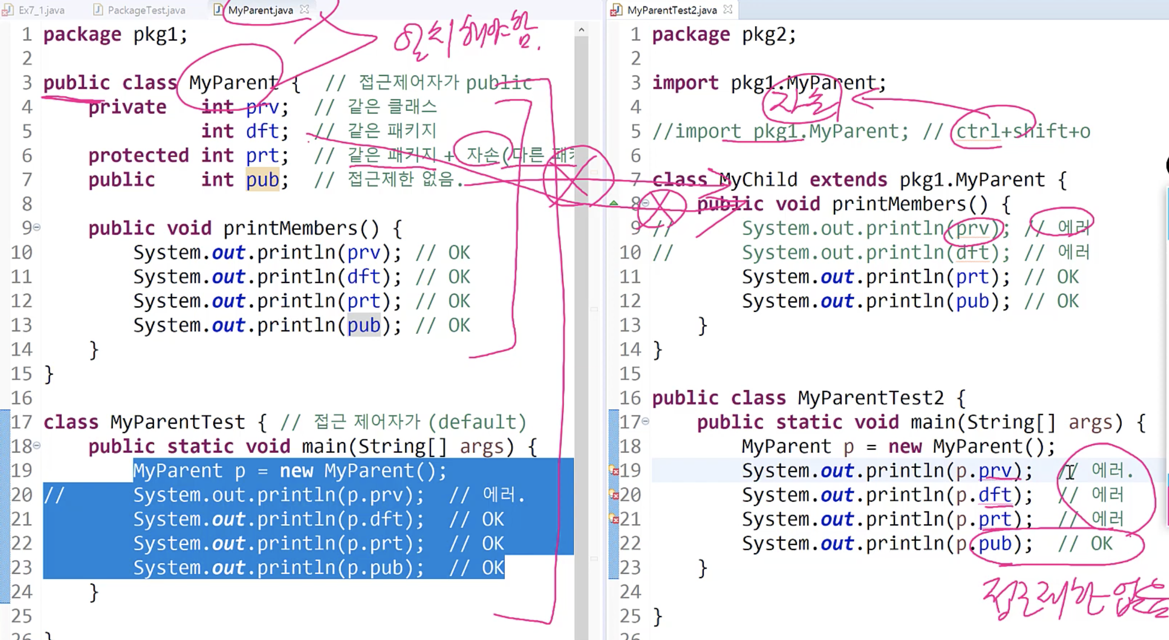 protected : 클래스 내부와 동일패키지 상속받은 클래스에서만 접근을 허용한다.