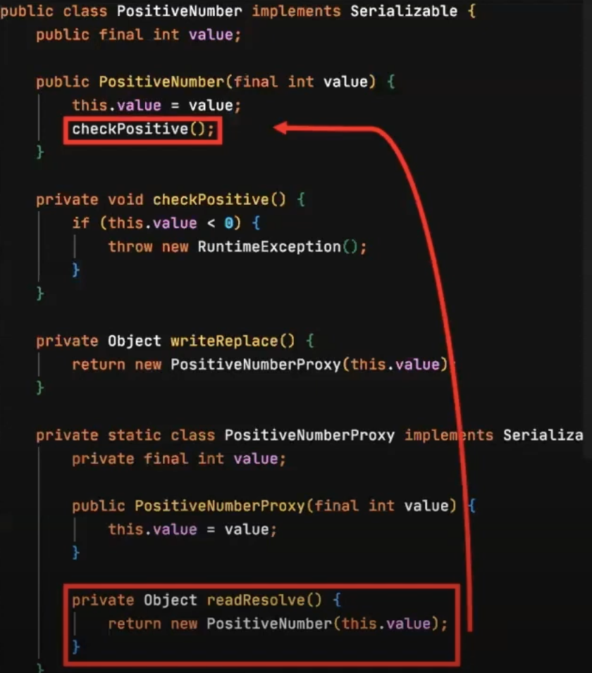 - 보이지 않는 생성자, readObject : readObject 생성자로 생성되기 때문에 누군가에 의해 값이 변경될 수 있다.