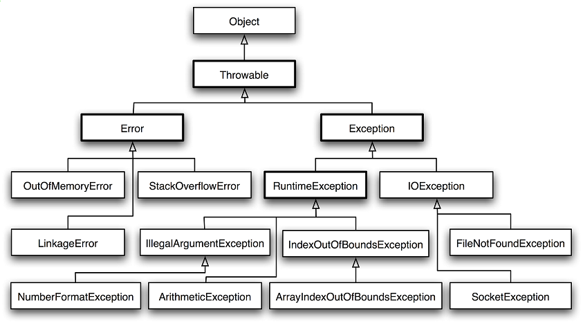 자바에서는 런타임 에러를 예외(Exception)와 에러(Error) 두 가지로 구분하여 대응하고 있다.