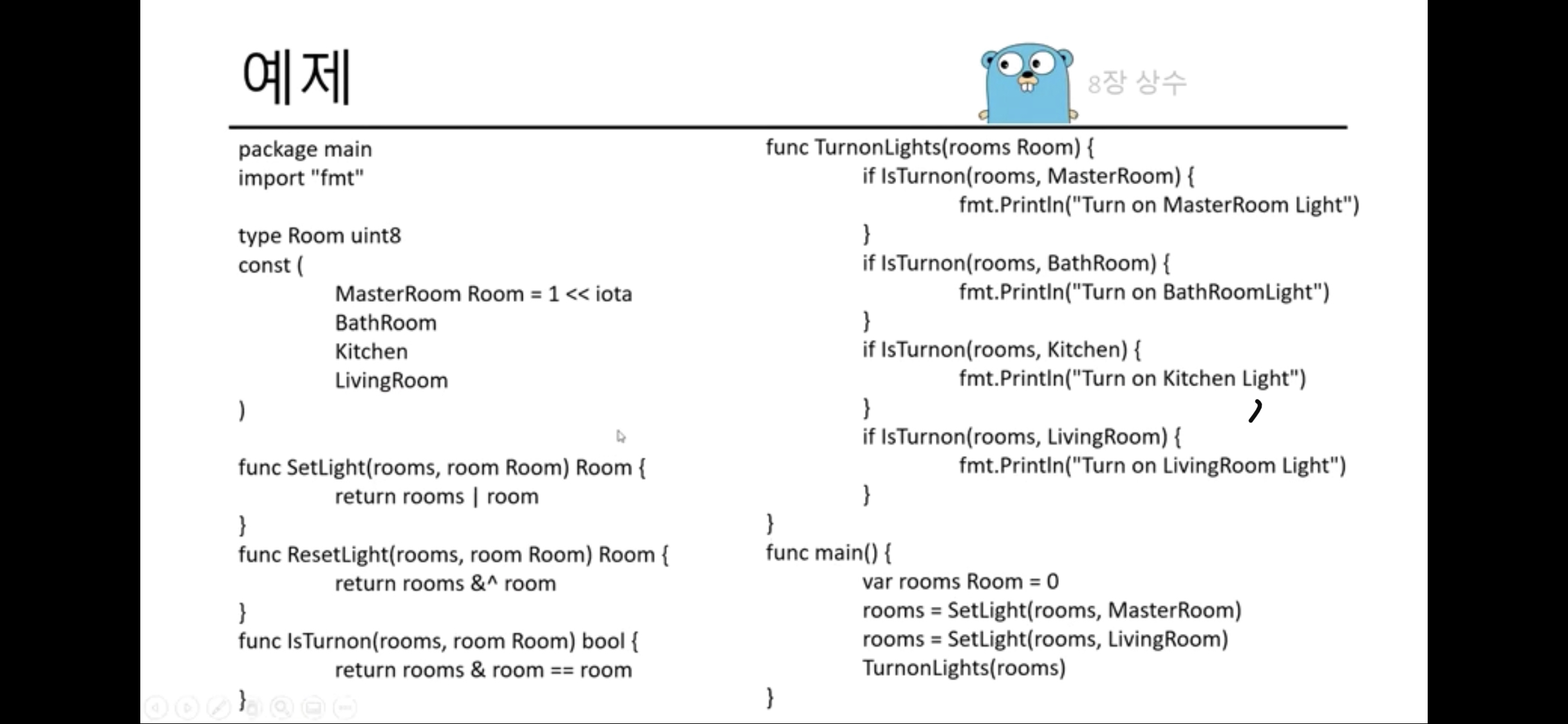 학습목표 비트연산자 쉬프트연산자 실수 오버플로우 논리 연산자 비트연산자 & 대응되는 비트가 모두 1이면 1을 반환함. (비트 AND 연산) | 대응되는 비트 중에서 하나라도 1이면 1을 반환함. (비트 OR 연산) ^ 대응되는 비트가 서로 다르면 1을 반환함. (비트 XOR 연산) &^ 비트 클리어 연산자. 특정 비트값을 열거할때 사용 ex. 10&^2 1단계 : ^연산을 수행합니다. 2 -> ^2 (1111 1101) 2단계 : & 연산을 수행합니다. 10 &^2 (0000 1000) ~ 비트를 1이면 0으로, 0이면 1로 반전시킴. (비트 NOT 연산) 쉬프트연산자 2) fmt.Printf("z:%08b z>>2:%08b z>>2: %d\n", uint8(z), uint8(z>>2), z>>2) fm..